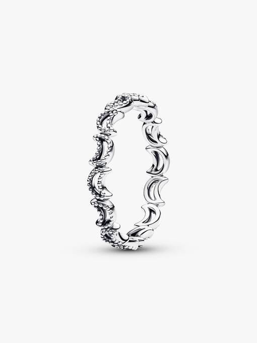 Lleva contigo la magia del cielo nocturno. Nuestro anillo de la luna creciente en plata de primera ley se presenta con una fila de lunas conectadas decoradas con esferas, un signo de unidad cósmica.
