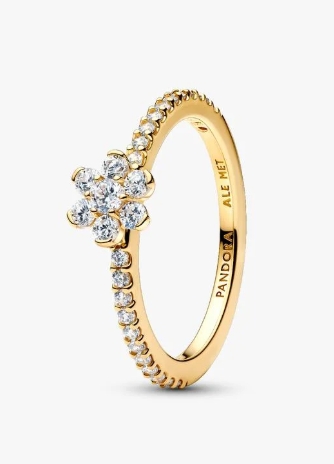 Pétalos para un momento perfecto. Nuestro anillo con un recubrimiento de oro de 14k se presenta con una flor en relieve embellecida con gemas transparentes y la mitad del eje decorado con pavé. Tu nuevo diseño brillante
