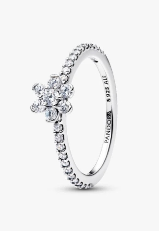 Una flor combinada con brillos. Creado en plata de primera ley, este anillo se presenta con una flor en relieve embellecida con gemas transparentes y la mitad del eje decorado con pavé. Una brillante declaración que elev