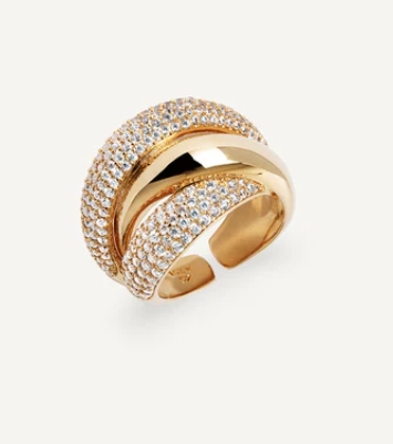 Anillo ancho cruzado Délum bañado con una gruesa capa de oro macizo de 18 kt, lo que garantiza una mayor durabilidad. Engastado con circonitas blancas