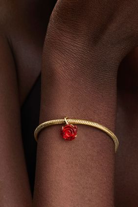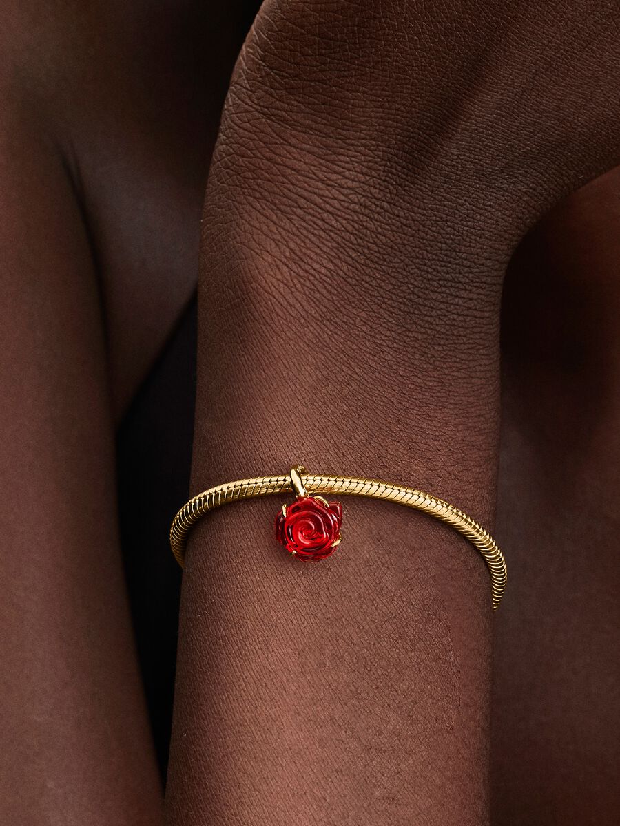 Inspirado en La Bella y la Bestia de Disney, este charm con recubrimiento en oro de 14k presenta una rosa de cristal de Murano rojo y una anilla con forma de tallo espinoso. Un símbolo de verdadera belleza, amor y bondad que rompe todas las maldiciones.