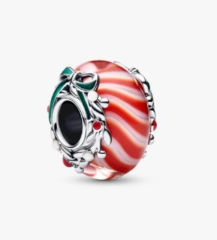 Una dulce explosión de alegría navideña. Este charm en plata de primera ley se presenta en cristal de Murano en llamativo color rojo y color blanco y tiene la forma de un caramelo. Fabricado por expertos, sus detalles ev