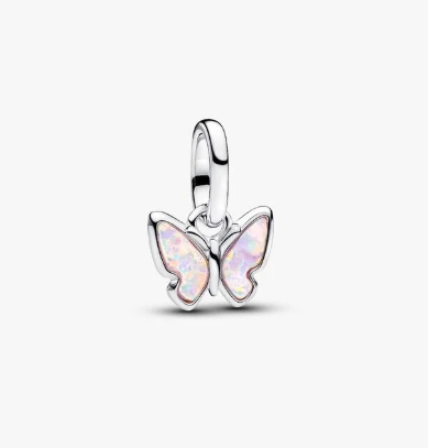 Deja volar tus sueños. Nuestro charm mini colgante de una mariposa en plata de primera ley brilla con el ópalo rosa creado en laboratorio que la decora, mientras que los detalles de estrellas y líneas en la parte inferio