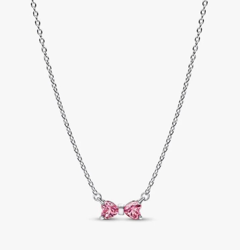 Atado con amor. En este collar en plata de primera ley, dos gemas de color rosa con forma de corazón forman un lazo que está fijado a la cadena. Es ajustable a tres longitudes diferentes, añádelo a tu combinación para da