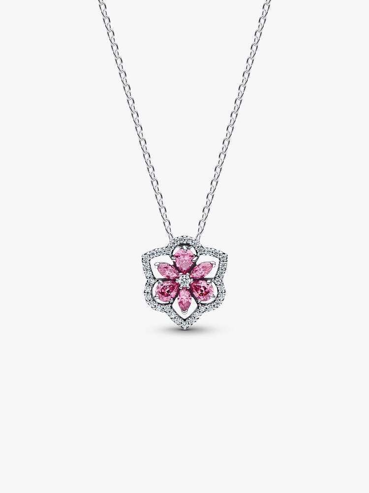 Haz una brillante declaración con nuestro collar con un colgante de una flor. Creado en plata de primera ley y gemas de color rosa y transparentes que forman un conjunto floral, el colgante se mueve libremente a lo largo