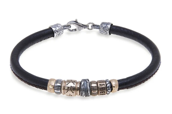 Esta pulsera de cuero liso con entrepiezas de Plata 925 y bronce confieren a la pieza de personalidad y estilo. Diseñada y hecha a mano artesanalmente por PLATADEPALO en España.