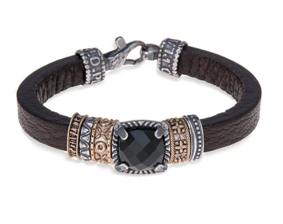 Pulsera PLATADEPALO de cuero, Plata 925 y bronce, onix facetado y circonitas. Diseñada y hecha a mano artesanalmente por PLATADEPALO en España. Esta pieza se realiza de forma artesanal para cada cliente.