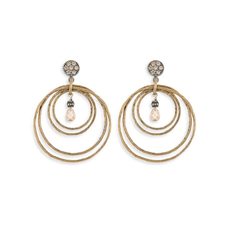 Pendientes con conjunto de aros móviles de bronce con un colgante central en forma de lagrima de circonita champagne y entrepieza de plata. Pasador y cierre de plata 925 hipoalergénico, con detalles de circonitas champagne.