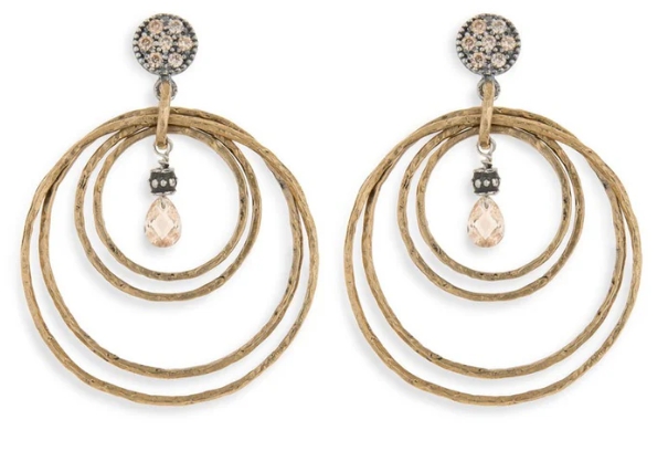 Pendientes con conjunto de aros móviles de bronce con un colgante central en forma de lagrima de circonita champagne y entrepieza de plata. Pasador y cierre de plata 925 hipoalergénico, con detalles de circonitas champagne.