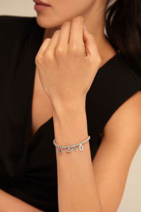 Inspirada en el misticismo de las culturas arábigas, esta pulsera bañada en plata consta de múltiples piezas perladas, de las que cuelgan tres charms: el candado propio de UNOde50, un medallón oval con cristal SWAROVSKI® ELEMENTS y la misteriosa Mano de Fátima, portadora de la protección y la suerte. Está hecho en España, por UNOde50 y 100 % a mano.