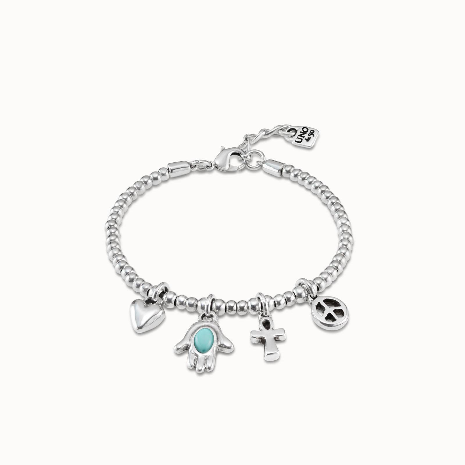 Pulsera formada por pequeñas cuentas en forma de bola y múltiples charms con diferente simbología: mano, corazón, símbolo de la paz y cruz con detalle de cristal de murano el color turquesa. Cierre de mosquetón regulable.