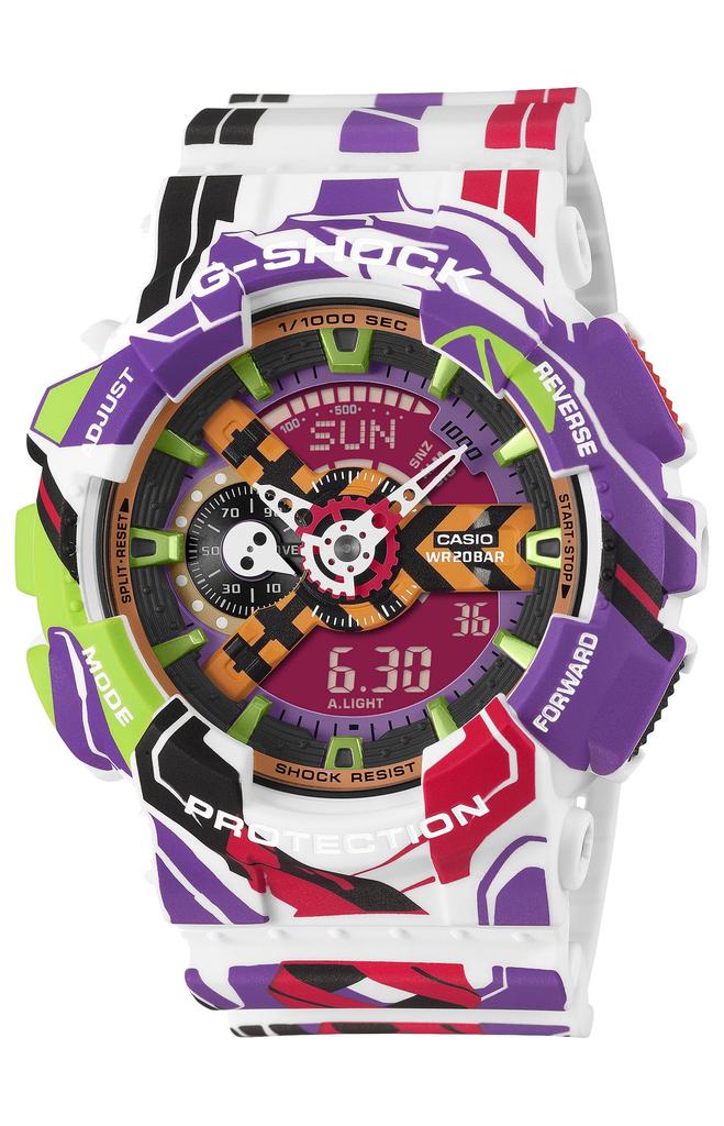 El GA-110, también utilizado en la primera colaboración EVANGELION en 2010, sirve como modelo base. La Unidad EVA-01, la figura central de la serie, aparece en todo el diseño: su casco con cuernos en la banda corta, su rostro en el bisel y su brazo derecho empuñando la Lanza de Longinos -justo antes del lanzamiento- que se extiende desde el bisel inferior hasta la banda larga. Las avanzadas técnicas de acabado de superficie de Casio reproducen fielmente las detalladas ilustraciones de Yamashita.