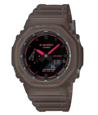 Sumérgete en la sensación de una luz misteriosa y ahumada con un reloj inspirado en la vida nocturna impulsada por la música. Estos nuevos relojes dan vida a la tenebrosa emoción de las discotecas y los festivales de música, con luces estroboscópicas láser que cortan el ritmo de la música de medianoche. El nuevo acabado de la superficie confiere a la esfera un aspecto limpio que complementa a la perfección el diseño aerodinámico de los relojes GA-2100. Esta superficie lisa es el lienzo ideal para el acabado brillante y la rica combinación de colores, que proyecta la increíble profundidad del negro piano. Las diferentes texturas y colores de los componentes del reloj evocan la escena musical nocturna. Los detalles en colores neón brillan como la luz de un láser, mientras que los materiales translúcidos con un acabado mate se emplean para dar al bisel y a la banda una fantástica textura que recuerda a la bruma de la pista de baile creada por una máquina de niebla. Un aspecto y un tacto totalmente nuevos: diseño de vanguardia con resistencia a los golpes G-SHOCK.