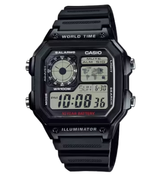 Te presentamos el AE-1200WHD: estilo y funcionalidad en perfecta armonía. Este reloj impresiona con una pila que dura 10 años. El cronómetro de 1/100 segundos aporta acción a su juego de cronometraje. Con la hora mundial y el mapamundi integrado, tendrás el globo terráqueo en tu muñeca. Y si eso no es suficiente, 5 alarmas diarias te ayudarán a pasar el día. El conjunto se completa con una luz LED y una resistencia al agua de hasta 10 bares: ¡aquí tienes tu reloj, listo para cualquier aventura! • DURACIÓN DE LA BATERÍA DE 10 AÑOS • Cronómetro de 1/100 seg. • Mapa mundial para la hora mundial • 5 alarmas • Luz LED • Resistente al agua hasta una profundidad de 10 bar